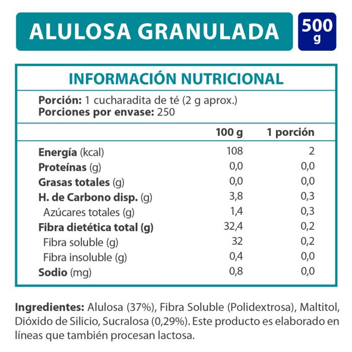 Endulzante Granulado Alulosa es la combinación perfecta de sabor, es un endulzante con un muy bajo aporte calórico y de origen natural, ya que está presente en la naturaleza en cantidades muy pequeñas, principalmente en frutas. Es perfecto para la cocina ya que se hornea, dora y carameliza como el azúcar. 1 taza de endulzante granulado = 2 tazas de azúcar. Sin Gluten. Formato Pack 12x500g.