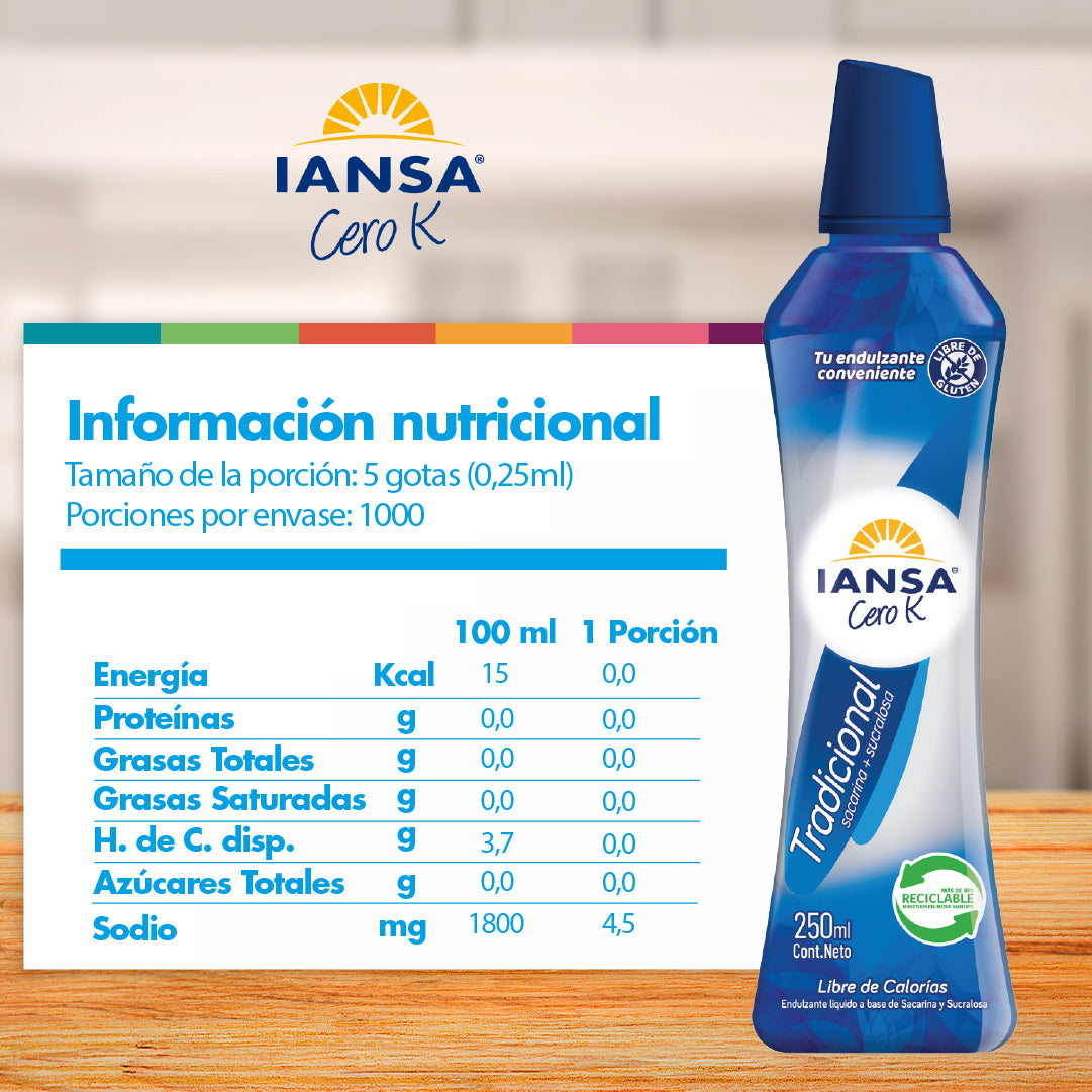 Con Iansa Cero K puedes endulzar tus momentos sin culpas. Tenemos stevia, sucralosa, alulosa y otras opciones para tu café, té, batidos o preparaciones. Sabor rico, cero calorías y formatos para todas tus necesidades.