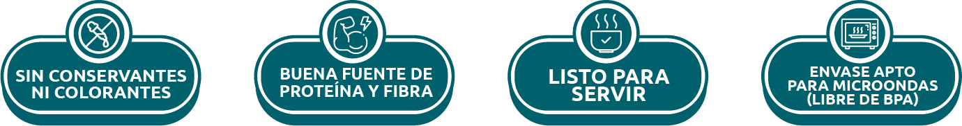 Exquisitos platos preparados con ingredientes de origen natural, listos para comer o calentar en sólo 2 minutos. La solución rápida y saludable con un toque gourmet. Son una excelente fuente de proteína y fibra, no tienen conservantes ni colorantes y su envase es apto para microondas (libre de BPA).