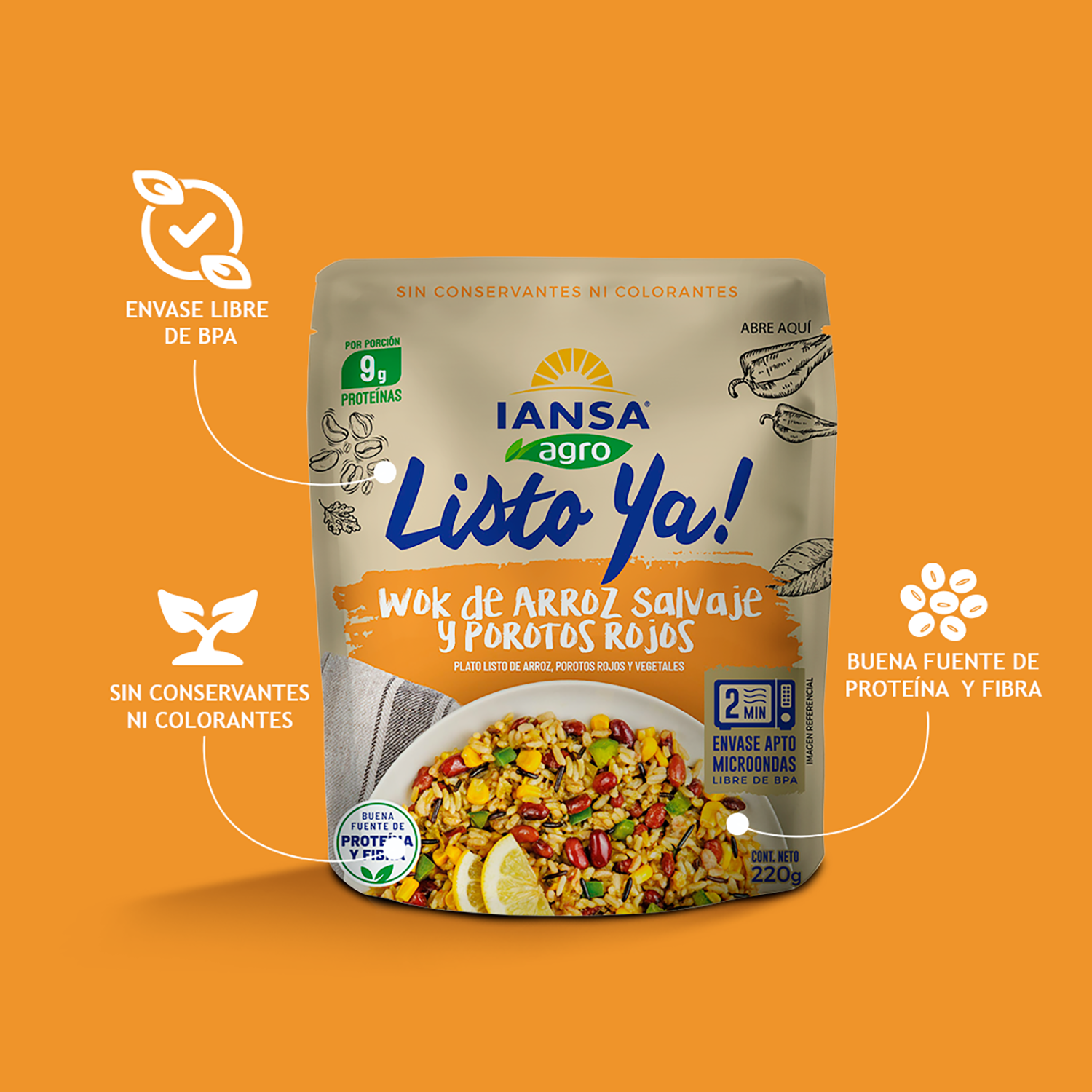 Exquisitos platos preparados con ingredientes de origen natural, listos para comer o calentar en sólo 2 minutos. La solución rápida y saludable con un toque gourmet. Son una excelente fuente de proteína y fibra, no tienen conservantes ni colorantes y su envase es apto para microondas (libre de BPA).